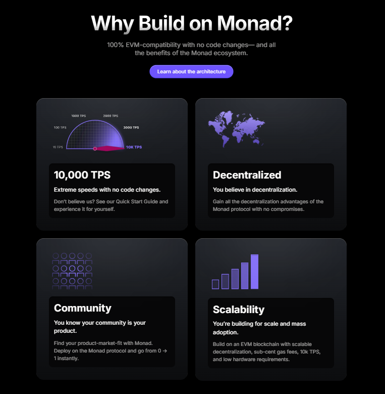 Monad is built to support the next generation of decentralized applications. Designed from the ground up with scalability in mind, Monad achieves: