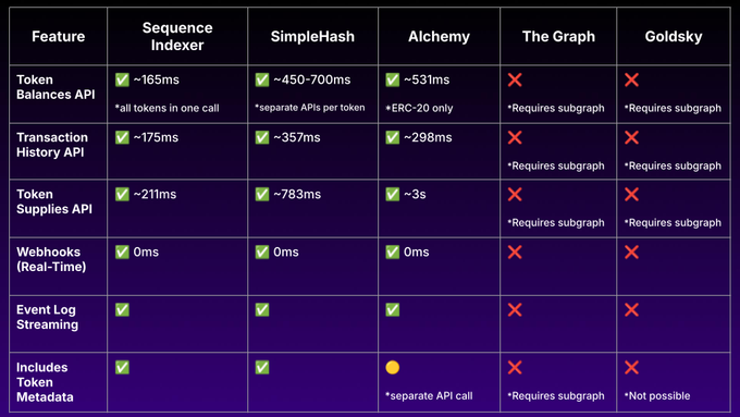 With SimpleHash's shutdown, wallets and apps must carefully evaluate alternative indexing solutions. We conducted benchmark tests on Sequence Indexer and other solutions, including performance benchmarks, feature completeness, and ease of integration.