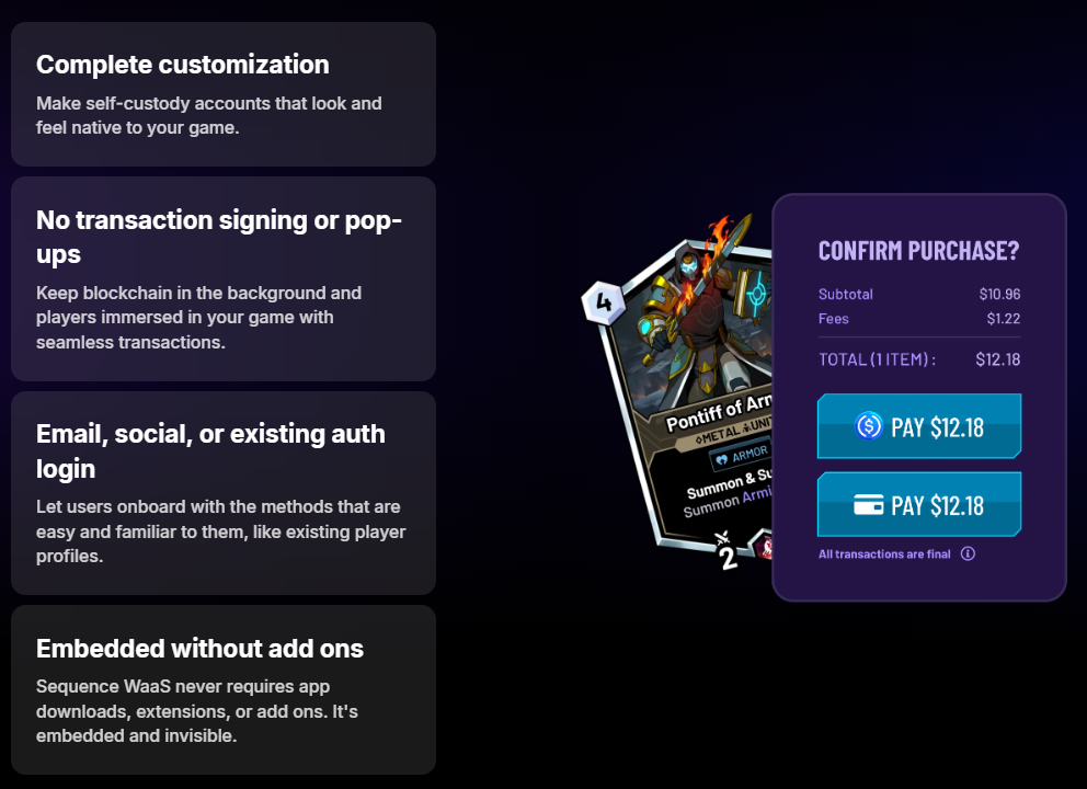 Sequence’s gaming-grade WaaS solution goes the extra mile to offer a simple, seamless, and convenient web3 experience, for both development teams and players.