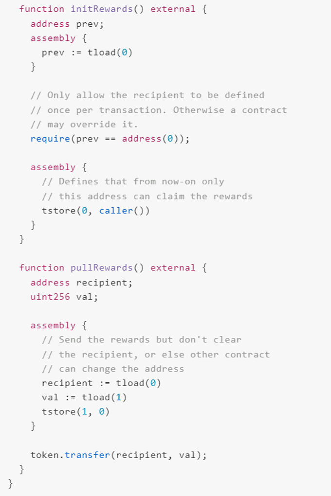 // SPDX-License-Identifier: Apache-2.0pragma solidity ^0.8.24;interface IERC20 {function transfer(address _to, uint256 _val) external;}contract RewardManager {IERC20 immutable token;address immutable owner;mapping (address => bool) public canReward;constructor (IERC20 _token) {token = _token;owner = msg.sender;}function setCanReward(address _addr, bool _b) external {require(msg.sender == owner);canReward[_addr] = _b;}function addReward(uint256 _val) external {require(canReward[msg.sender]);assembly {// Add pending rewardslet prev := tload(1)tstore(1, add(prev, _val))}}function initRewards() external {address prev;assembly {prev := tload(0)}// Only allow the recipient to be defined// once per transaction. Otherwise a contract// may override it.require(prev == address(0));assembly {// Defines that from now-on only// this address can claim the rewardststore(0, caller())}}function pullRewards() external {address recipient;uint256 val;assembly {// Send the rewards but don't clear// the recipient, or else other contract// can change the addressrecipient := tload(0)val := tload(1)tstore(1, 0)}token.transfer(recipient, val);}}